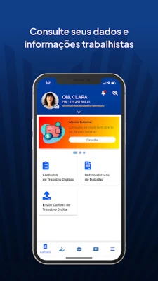 A Carteira de Trabalho Digital permite ao cidadão acompanhar sua trajetória profissional de forma prática. Acesse seus dados pessoais e visualize todos os contratos de trabalho registrados na sua Carteira de Trabalho e Previdência Social, tudo em um só lugar. Uma visão clara da sua vida laboral.