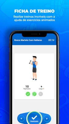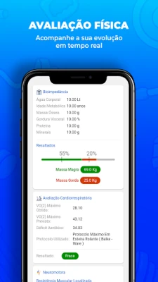 Mergulhe em uma metodologia de treino inteligente e envolvente. Sua ficha de treino é totalmente interativa, com animações que demonstram cada exercício, ferramentas para a definição precisa de carga, um cronômetro integrado e controle do tempo de execução, otimizando cada sessão. Além disso, acompanhe sua evolução de forma clara e objetiva: visualize e compare suas avaliações físicas, obtendo insights valiosos para ajustar e aprimorar seu desempenho constantemente.