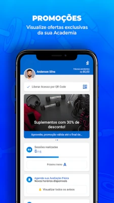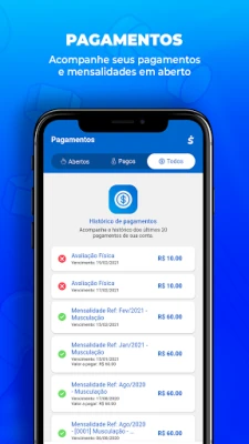 Mantenha-se conectado e informado. Interaja com sua academia de forma simplificada através da central de contato e esteja sempre a par das últimas novidades e publicidades. Gerencie aspectos administrativos sem complicações: consulte suas informações cadastrais, acompanhe o histórico detalhado de pagamentos de mensalidades, visualize os horários de acesso e mantenha um histórico completo de suas matrículas. A praticidade se estende ao acesso físico, com a funcionalidade de entrada por QR Code, agilizando sua chegada.