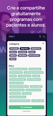 Para profissionais, Wolt é a plataforma que revoluciona a prática. Crie e compartilhe programas personalizados para seus pacientes e alunos com facilidade, elevando a qualidade do acompanhamento e economizando tempo precioso na busca por recursos. Já para atletas, alunos e indivíduos em busca de melhoria, Wolt oferece a estrutura para superar limites, prevenir lesões e alcançar novos patamares de saúde e desempenho, recebendo inclusive os protocolos de treinamento diretamente de seus profissionais. Wolt é mais do que um aplicativo; é um ecossistema que potencializa a saúde e o movimento para todos.